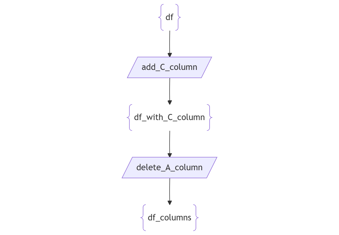 In this script the function delete_A_column will get a variable that has been seen before and will not be able to trace back to the function add_C_column. This is because the memory address of df_with_C_column has changed in the line df_with_C_column_copy = df_with_C_column.copy().